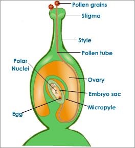 After the pollen grain is transferred to the stigma it produces a pollen tube which passes through the style and enters the ovary and ovule. In the ovule the male germ cell fuses with the female germ cell to produce zygote. This process of formation of single celled zygote is called fertilization. Zygote then divides several times and forms the embryo which then develops into the seed and the ovary develops into the fruit.