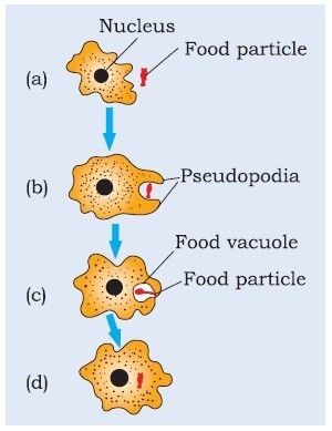 Amoeba is a unicellular animal. It takes in food by forming finger like projections called pseudopodia and forms a food vacuole. Inside the food vacuole the food is digested and absorbed. The undigested food is then sent out through the surface of the cell.