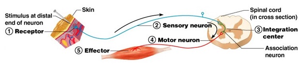 The pathway of a reflex action is called reflex arc. In a reflex arc the stimulus is received by the receptors (sense organs) and it passes through the sensory nerves to the spinal cord. From the spinal cord the information is passes through the motor nerves to the effectors (muscles/glands) for the response.